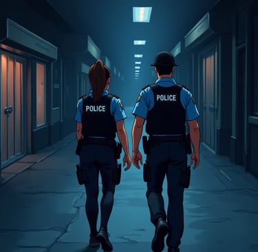 Finally, dark shadows appeared at the end of the corridor and as they came closer we could see that ... there were now three people! The two police officers and a homeless man carrying some cardboard! They sternly made him throw away the cardboard and move on.